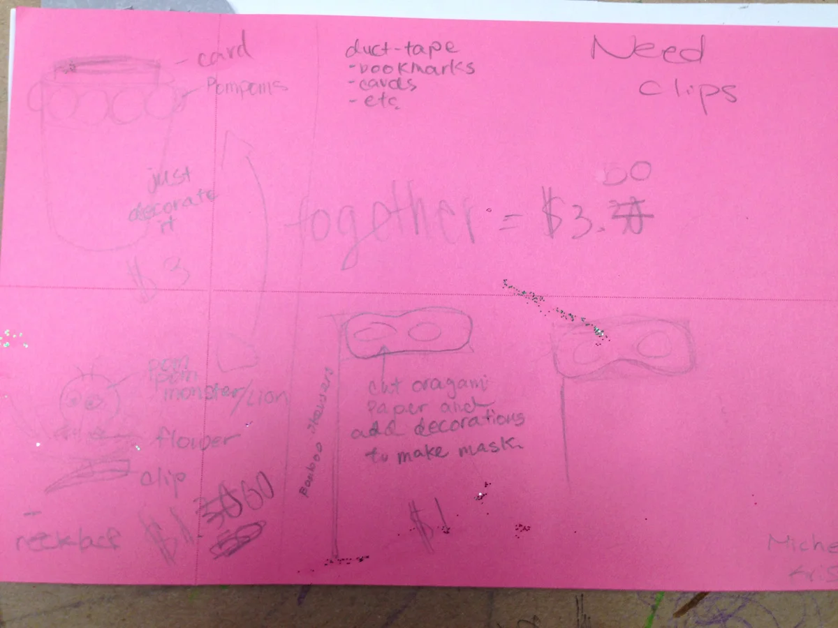 Let's figure out what we can make with the resources we have! Take a look at the white board photos to see our finalists for products!