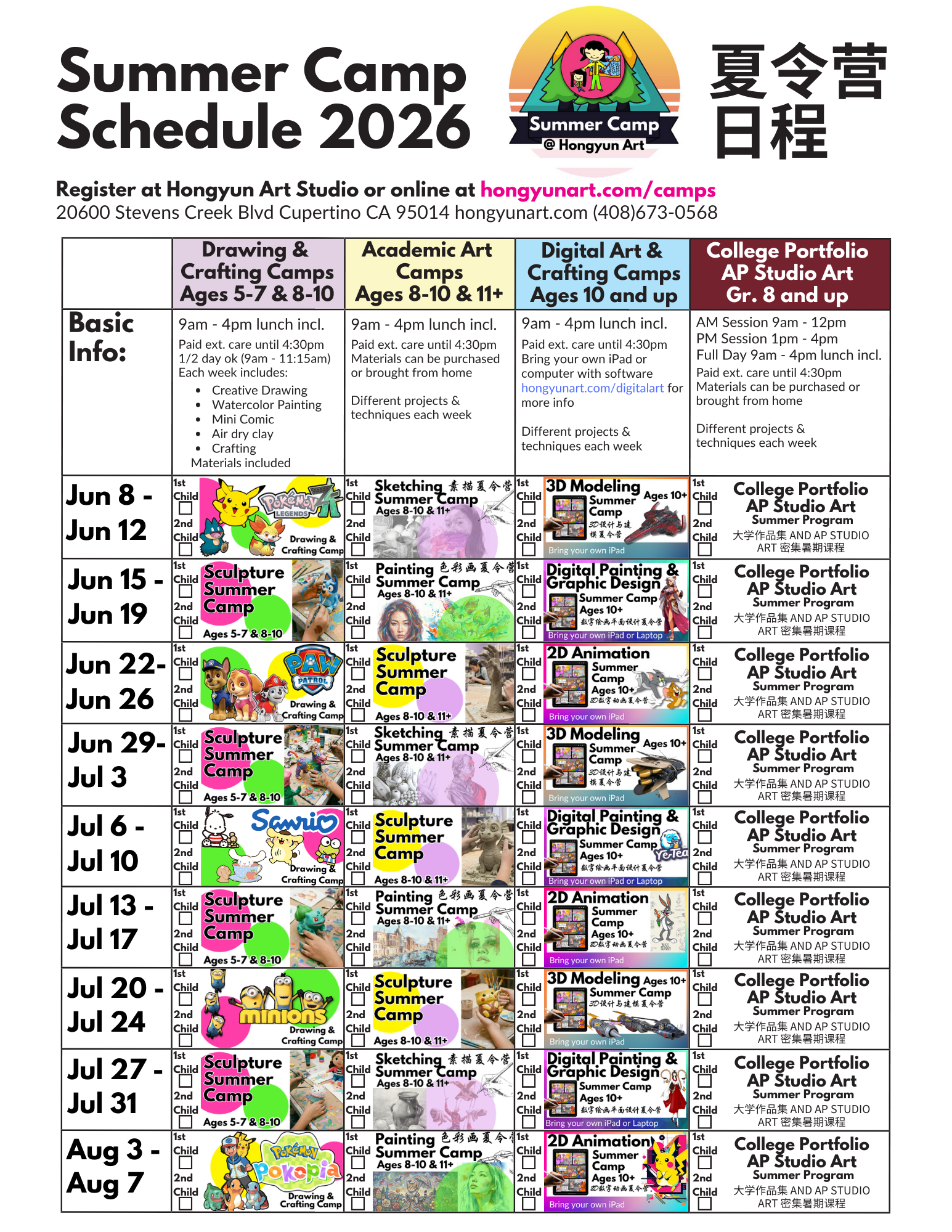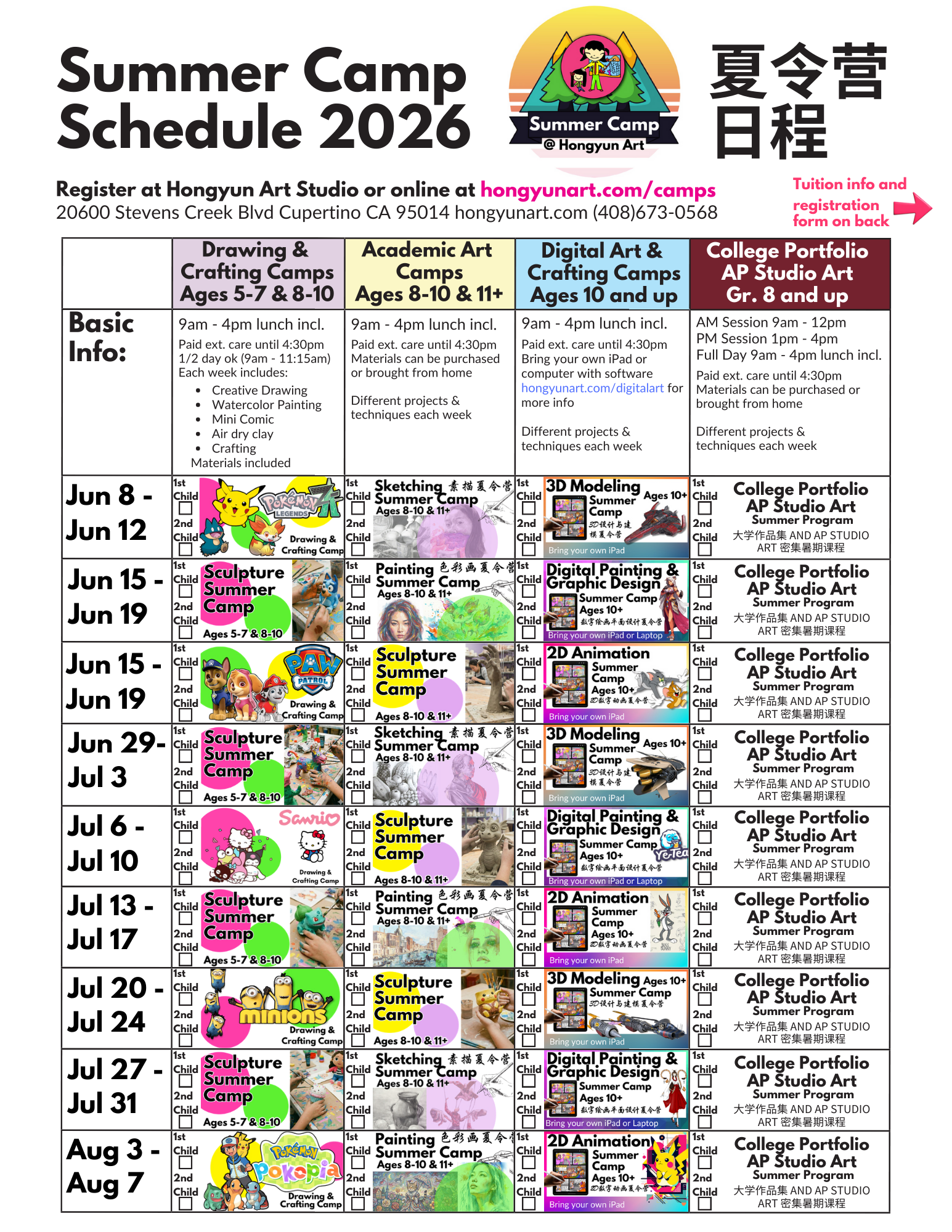 Ages 8-10 & 11 and up CLICK -> Academic Art Summer Camps 夏令营