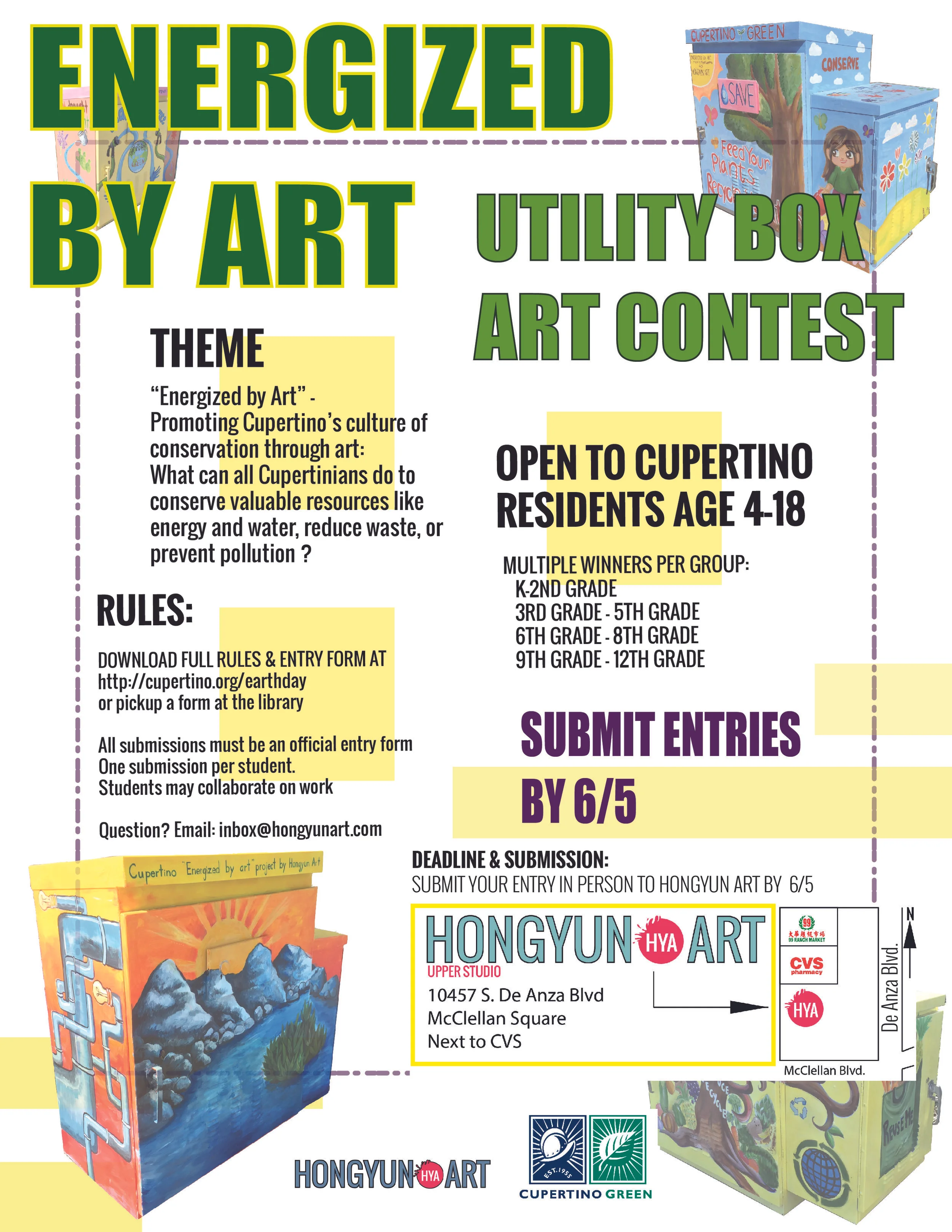 Energized by Art is a project by a partnership between the City of Cupertino and Hongyun Art. All winner were chosen by the City of Cupertino Fine Arts Commission and Sustainability Coordinators. The artwork is painted on the utility box by the winning artist with the assistance of Hongyun Art Students and Teachers.